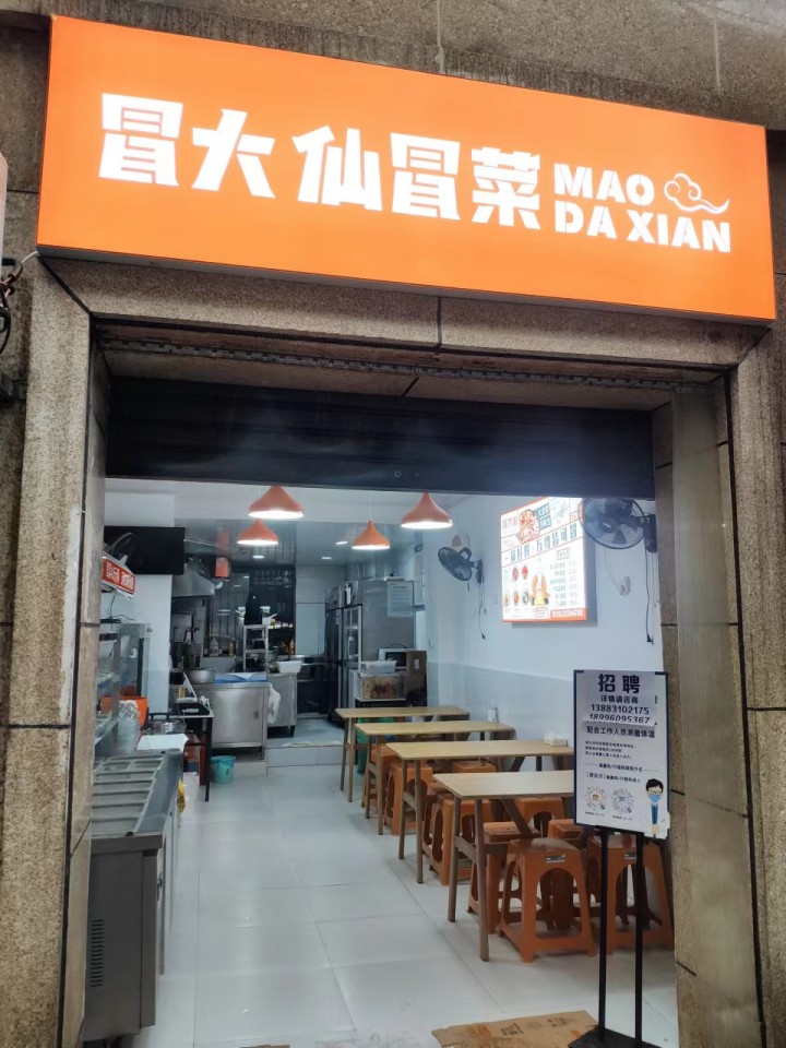 本店位于沙坪坝-三峡广场-一号出口门口,店铺是加盟连锁店《冒大仙冒菜》。